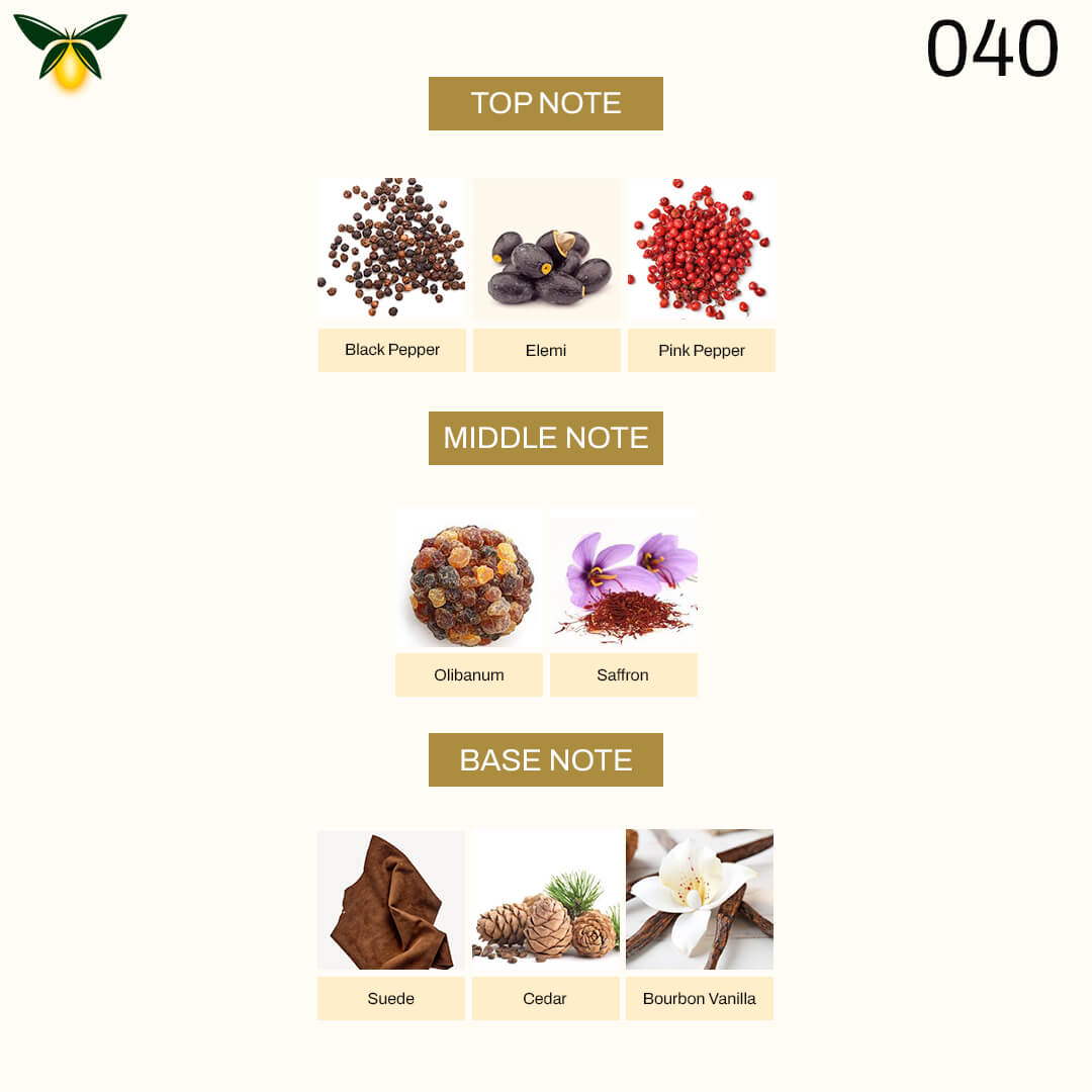 Top Notes: Black and Pink Pepper, Black Pepper, elemi and Pink Pepper